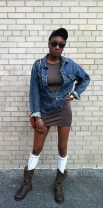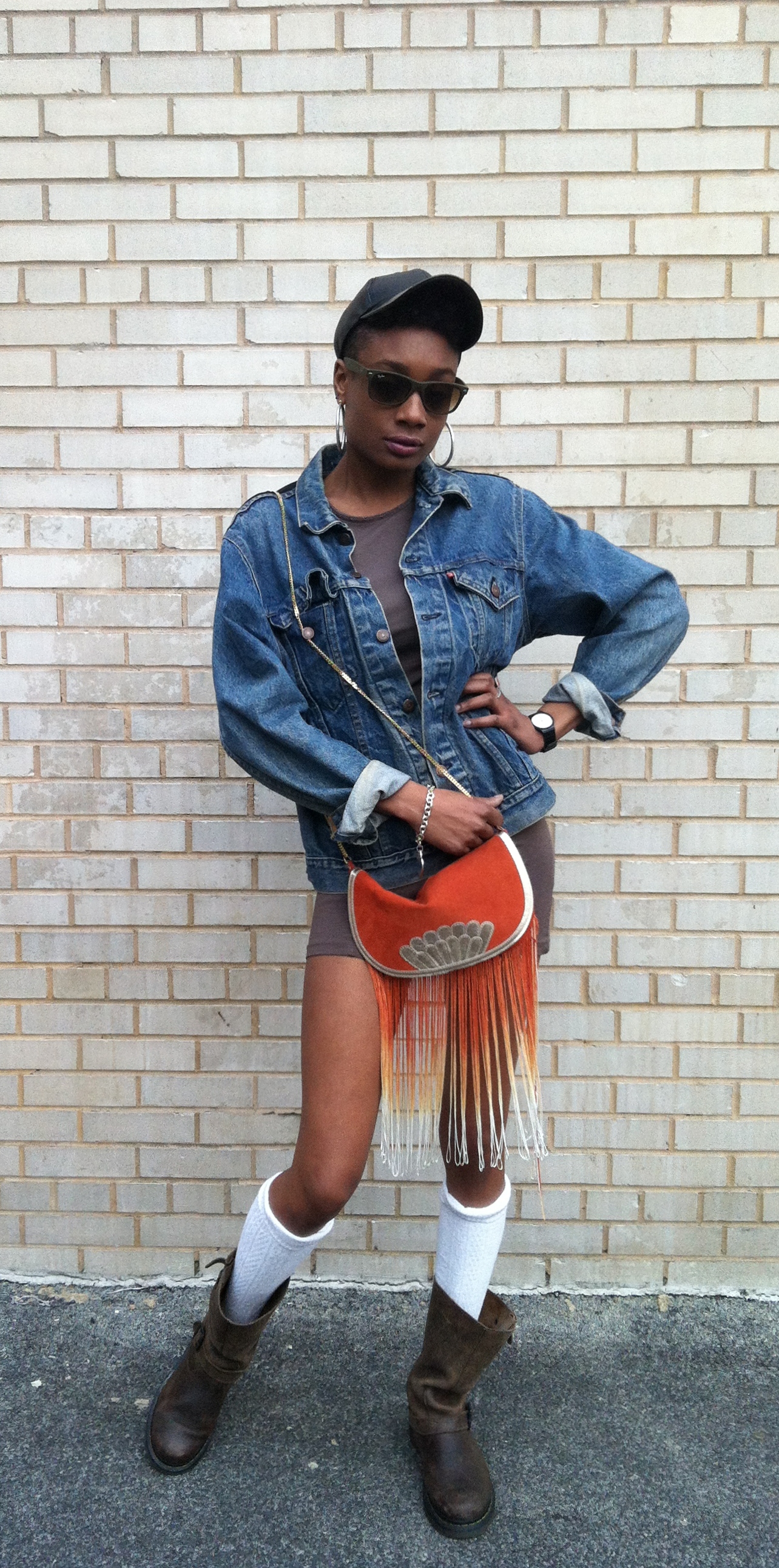 I love the under the knee socks, the sunglasses and jean jacket!!